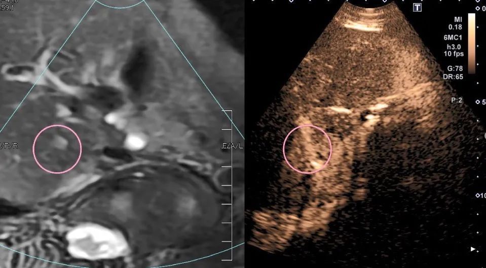 该患者是66岁直肠癌术后患者,在肿瘤内科化疗期间,肝VI段新发现转移病灶,经由我院肝胆胰外科多学科诊治团队(MDT)专家的共同会诊,决定行肝肿瘤的射频消融术,后续肿瘤内科根据肿瘤病理更换内科治疗方案。但对于这个患者的病灶存在技术难点。其一,肿瘤微小,仅有0.6cm,肿瘤位置深在,位于肝VI段近尾状叶,肿瘤紧邻右门静脉及右后叶分支,位置极其“刁钻”;其二,在平扫CT和普通超声检查基本不可见,位置极其“隐蔽”。这就为普通影像指导的射频消融带来了很大的麻烦。